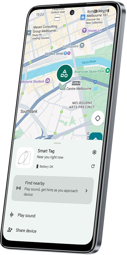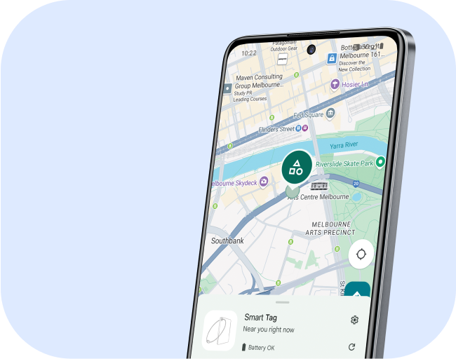 Requires Android 9.0 phone and up. Smart Tag must be within 100 meters of any Android device. UWB precision requires supported Android phone; UWB available upon future Android integration. Android is a trademark of Google LLC.Google, Android, and Find Hub are trademarks of Google LLC.